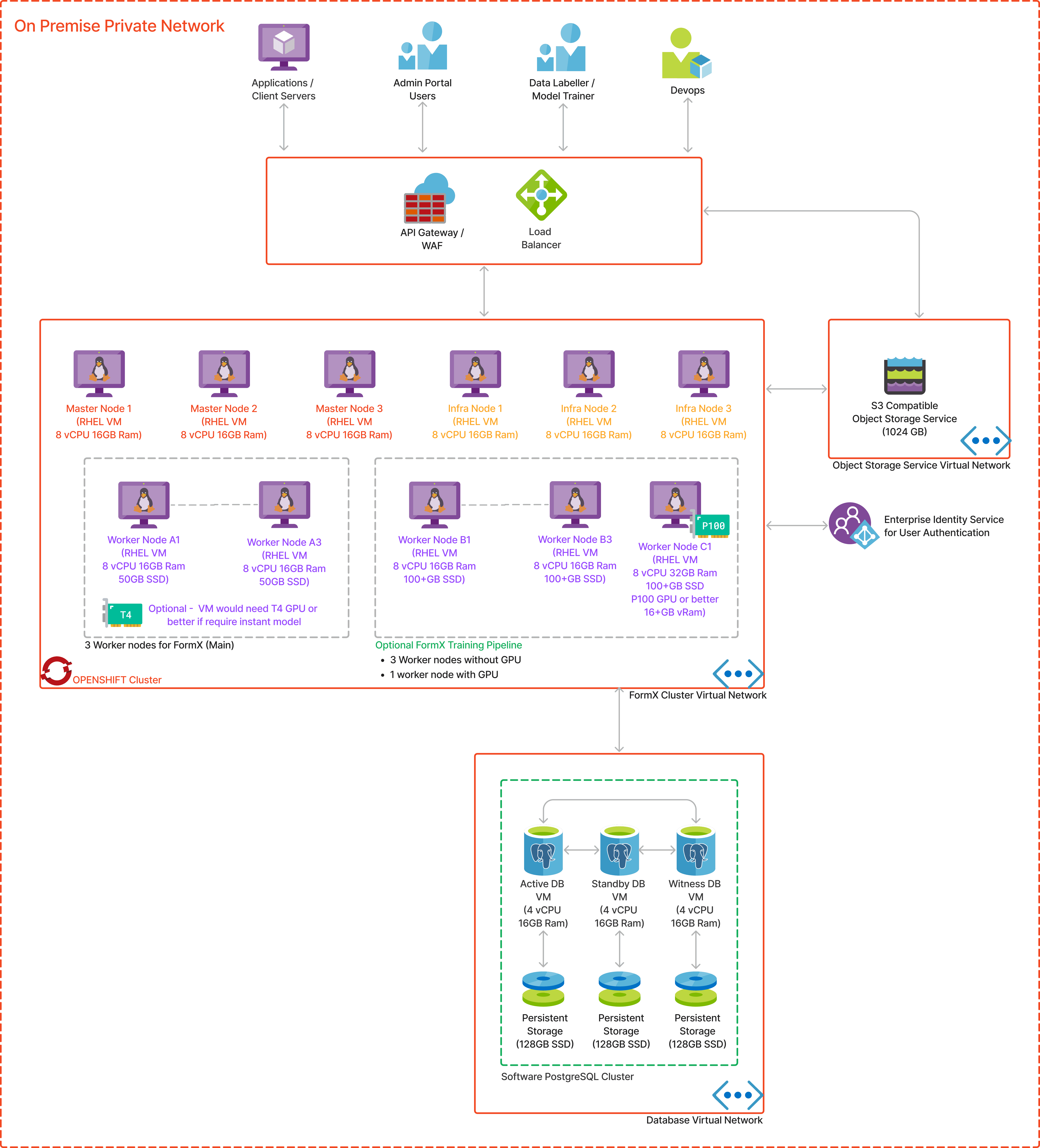- PostgreSQL could be deployed on VMs, or in OpenShift backed by OpenShift Container Storage. If high availability is required, we recommend an Active-Standby-Witness mode of deployment.