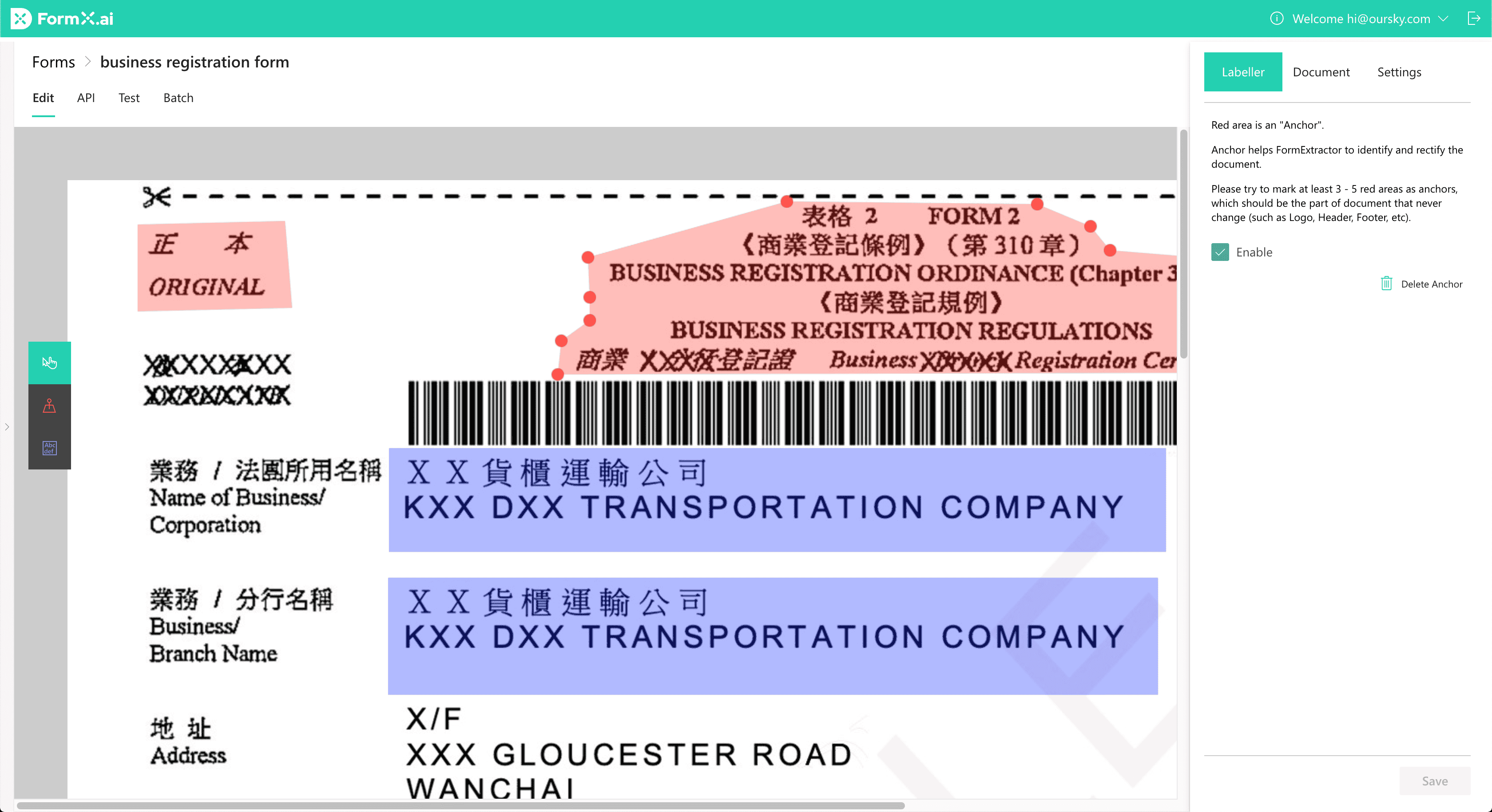 As mentioned above, to boost image warping accuracy, Anchors should be spread across the master form as much as possible, which is indicated by the green box in the below image. That way, FormX learns more about your form's appearance, hence can yield better extraction results. We have marked only three here for simplicity, whereas our actual Business Registration form template has much more Anchors.