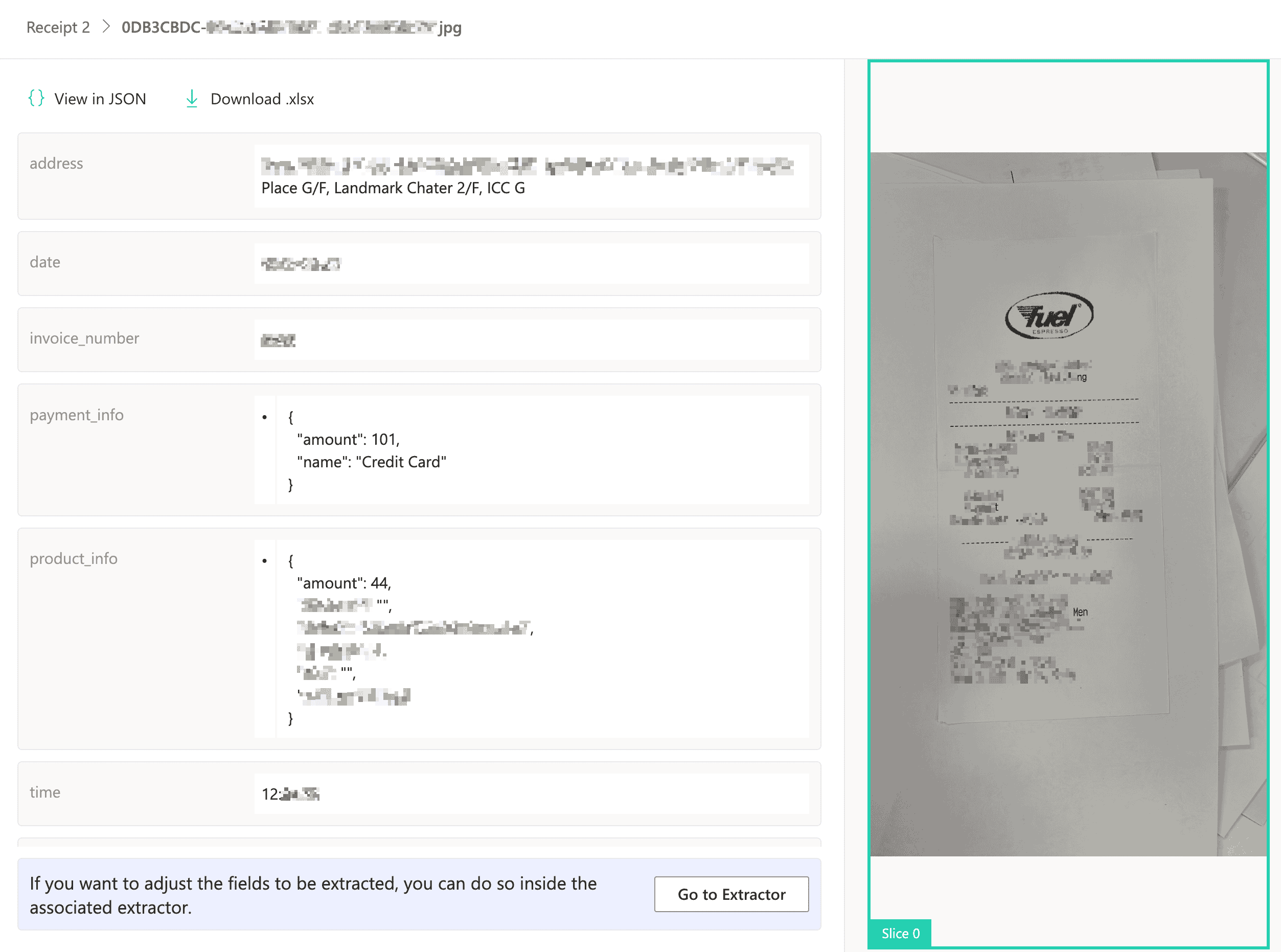 The extraction result can be downloaded as Excel files. Select the files you needed by checking the box next to the file names and click the "Export as Excel" button in the document listing page.